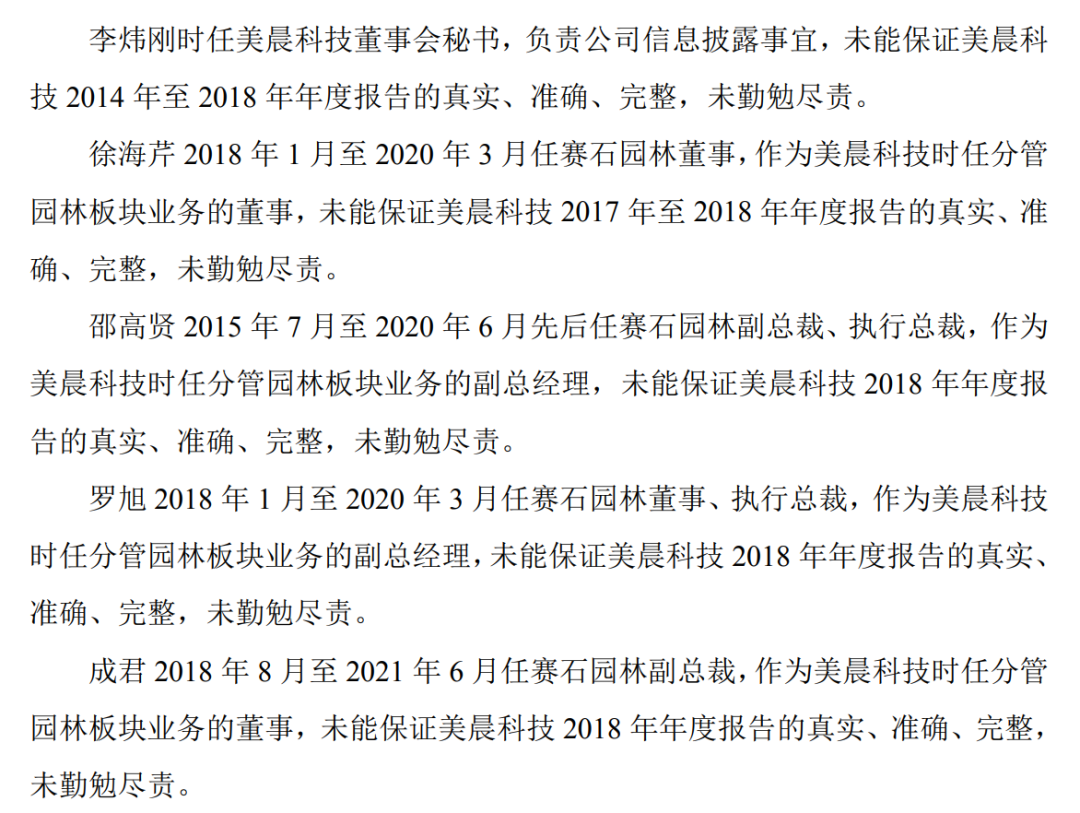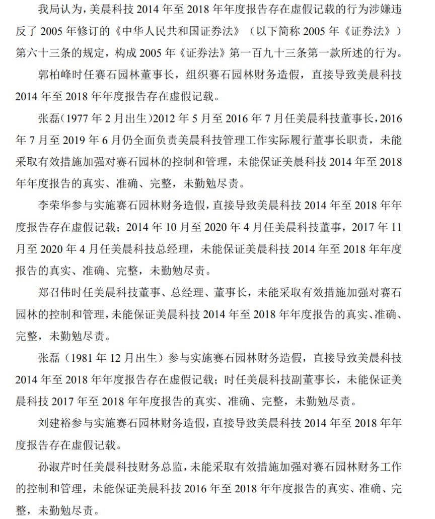 而赛石园林时任董事长郭柏峰,被山东证监局认为组织赛石园林财务造假,直接导致美晨科技2014年至2018年年度报告存在虚假记载。美晨科技时任董事长张磊(1977年2月出生)、美晨科技时任董事李荣华等十余名公司高管及相关人员,也被山东证监局认为未能保证美晨科技2014年至2018年年度报告的真实、准确、完整,未勤勉尽责。