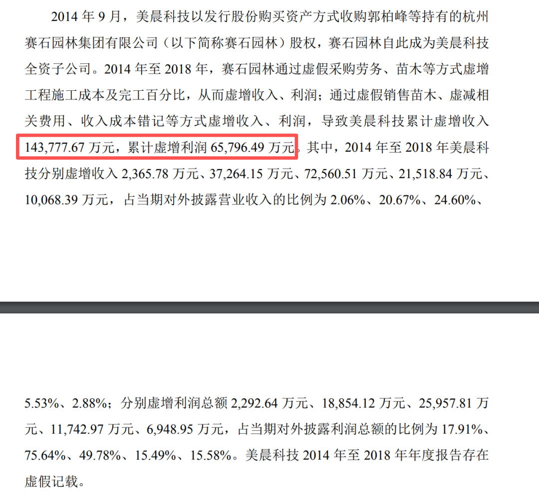 2014年至2018年,赛石园林通过虚假采购劳务、苗木等方式虚增工程施工成本及完工百分比,从而虚增收入、利润;通过虚假销售苗木、虚减相关费用、收入成本错记等方式虚增收入、利润,导致美晨科技累计虚增收入14.38亿元,累计虚增利润6.58亿元。美晨科技2014年至2018年年度报告存在虚假记载。