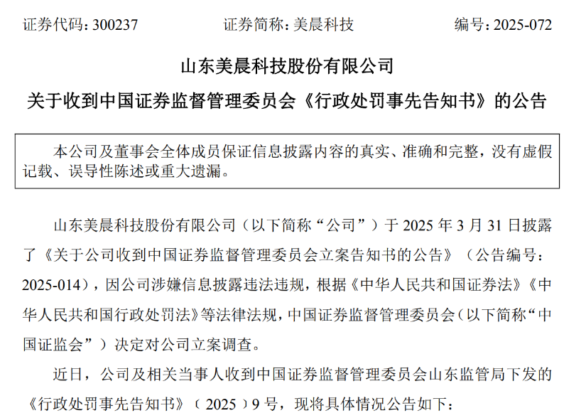 9月26日晚,美晨科技发布公告,公司及相关当事人收到山东证监局下发的《行政处罚事先告知书》,美晨科技涉嫌信息披露违法违规一案已由山东证监局调查完毕,山东证监局依法拟对公司及相关当事人作出行政处罚。